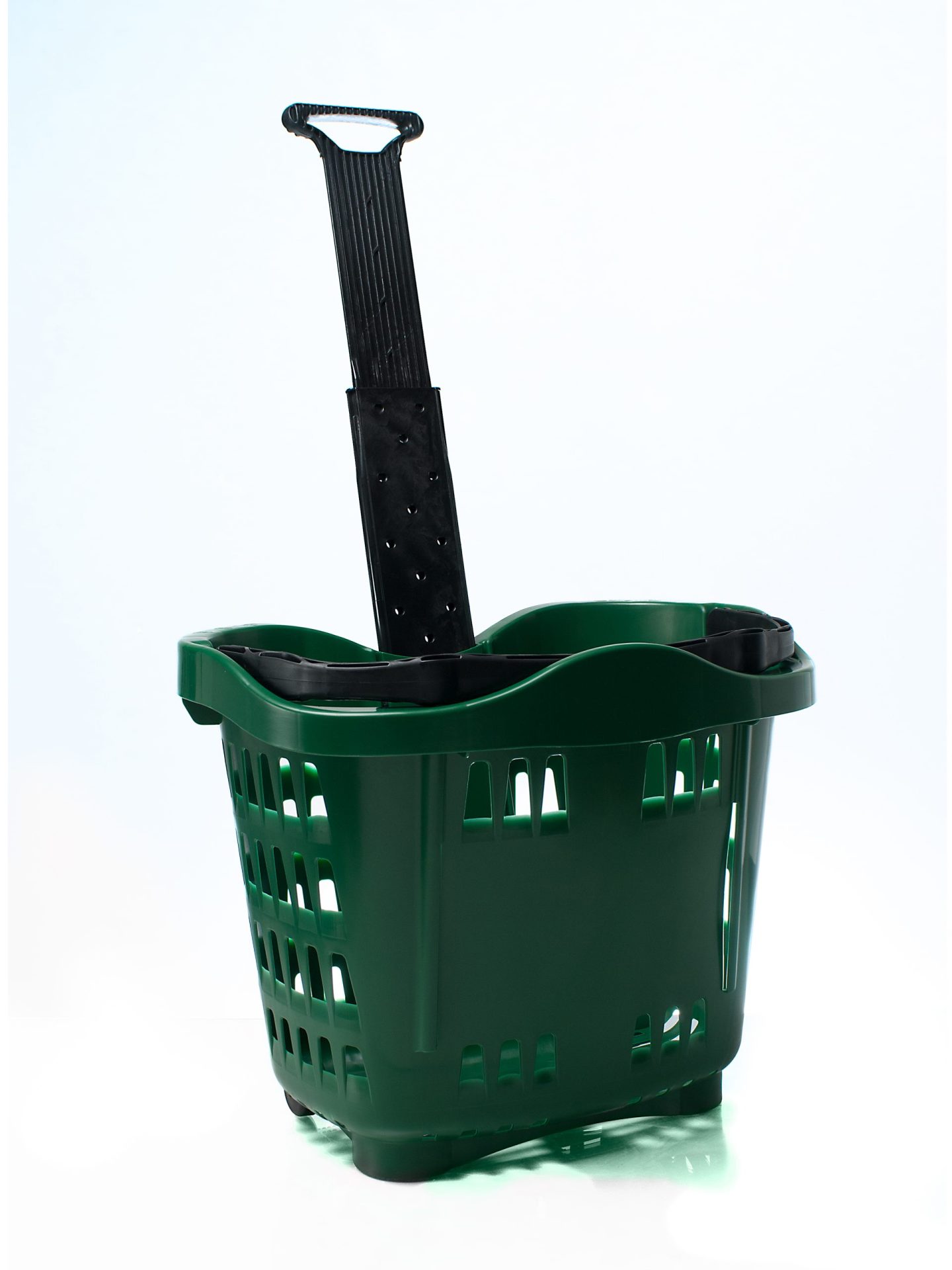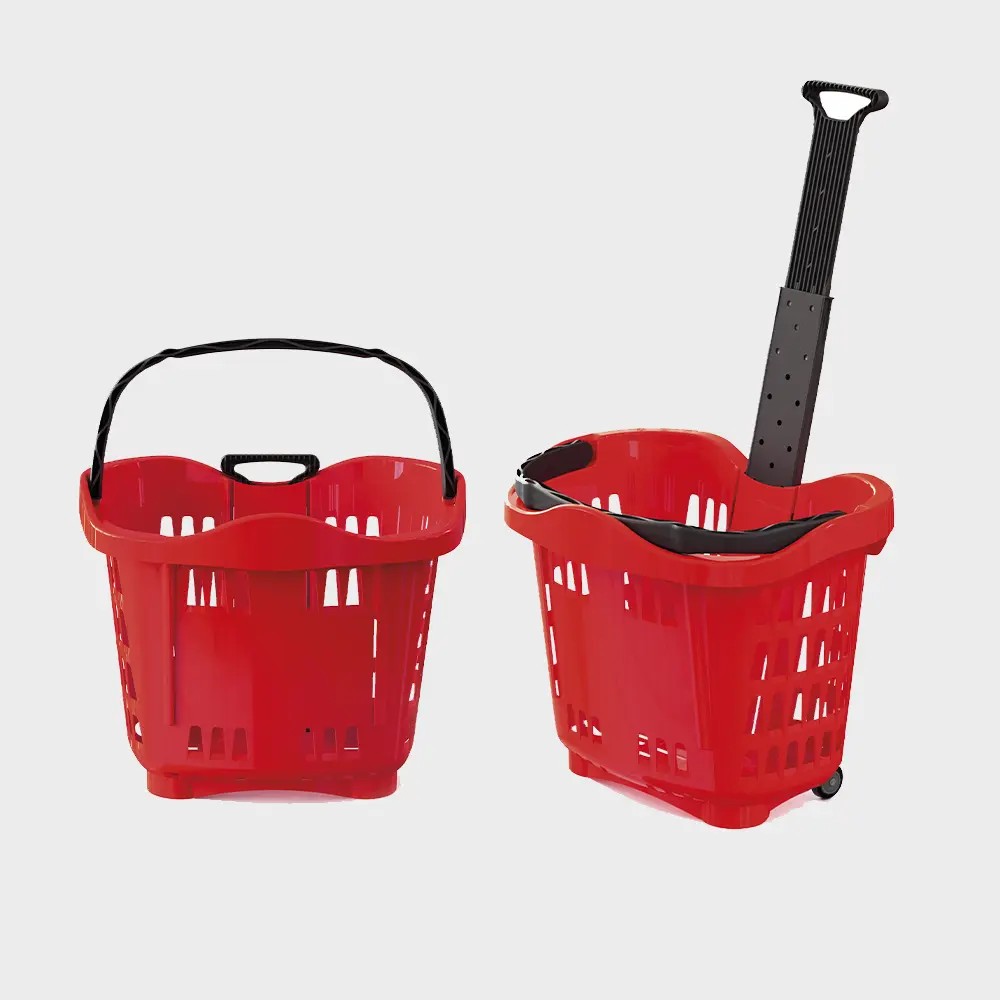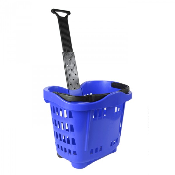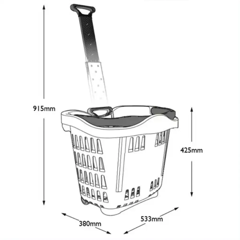 A new addition to our range, this sturdy basket has a huge 43 litre capacity. Standing 915mm high, and with a large flat base it provides some stability for older shoppers, and can be pushed or pulled along. As customers do not have the fatigue of carrying a basket, they can shop for longer and spend more. They have two fixed wheels. Basket size externally is 425h x 533w x 380 deep