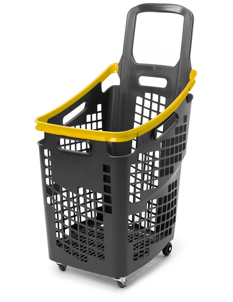 A new addition to our range, this sturdy basket has a large flat base and huge 65 litre capacity. At 875mm tall, it provides some stability for older shoppers, and can be pushed or pulled along. As customers do not have the fatigue of carrying a basket, they can shop for longer and spend more. They have two 50mm fixed castors and two 30mm swivel castors. Base size externally is 390 x 540mm.